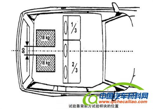 将两个类型 1 的试验样块放置于行李舱的地板上,为了确定试验样品纵向安放位置,应将试验样块放置在行李舱底部,其前部与构成行李舱前边界的车辆部件接触,然后沿平行于车辆的纵向中心方向将其向后移动直至其质心移200mm的水平距离若行李舱的尺寸限制了上述200mm的移动且后排座椅的前后位置可以调节的话,则将这些座椅向前移动到乘员正常使用位置范围的最后边界或者移动到可以获得上述 200mm 的位置处,取两者中较小者对于其它情况,试验样块应尽可能远地放置于后排座椅之后,车辆纵向中心面与各试验样块内侧边缘的距离应该为25mm,以使两样块之间有 50mm的距离。