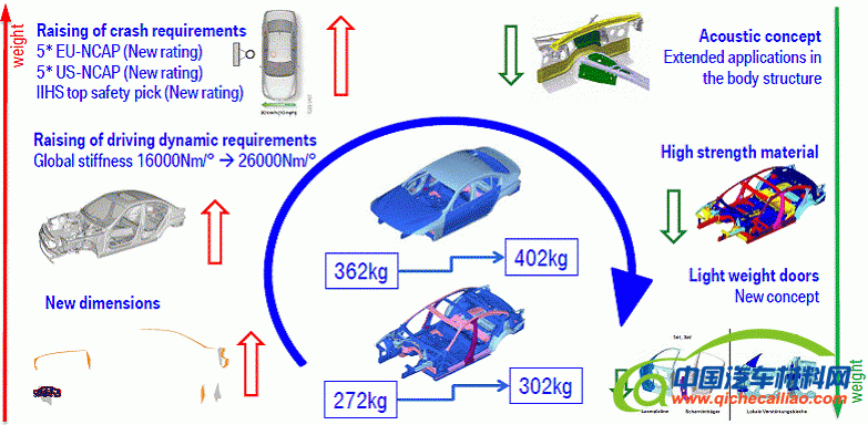 该车的轻量化系数为3.5,比上一代产品轻量化系数降低30%。轻量化系数的降低主要得益于车身刚度的提升,遗憾的是车身上也采用了很多轻量化的材料和设计,但是重量还是比上一代增加了近40公斤(见图2)。这也许是做轻量化的工程师们应该关注的,轻量化系数降低了,但车身重量增加了,究竟是以轻量化系数还是以车身的重量来评价我们的成果呢?但这个尺寸的车身,400KG的重量还是比较低的。