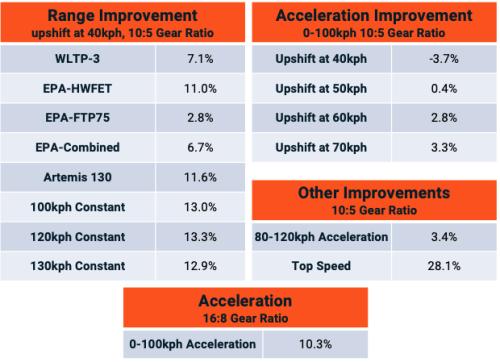 By enabling the drivetrain to operate more efficiently with low- and high-gear ability, less energy is wasted resulting in more range from each charge. Similarly, regeneration is improved and is continuous, even while downshifting.