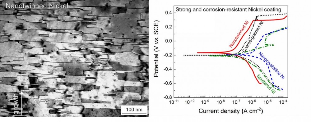 "Our technology enables the manufacturing of nanotwinned nickel coatings with high-density twin boundaries and few conventional grain boundaries, which leads to superb mechanical, electrical properties and high corrosive resistance, suggesting good durability for applications at extreme environments," said Qiang Li, a research fellow in materials engineering and member of the research team. "Template and specific electrochemical recipes suggest new paths for boundary engineering and the hybrid technique can be potentially adopted for large-scale industrial productions."