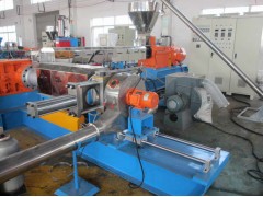 PVC造粒机,PVC电缆料造粒机(设备);高混机——螺旋自动上料机——双螺杆造粒机——单螺杆造粒机——对吹热切机头——级旋风分离器——二级旋风分离器——加长风冷振动筛——成品料仓;