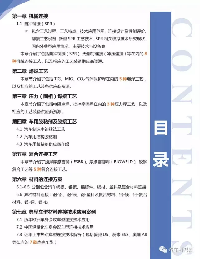 中国汽车产业在经过了多年高速增长后,进入了产业转型和技术升级的新时期。尤其是新能源汽车企业的崛起,加速了行业新材料和连接技术的应用步伐。传统以钢为主的用材结构,正向着钢/铝混合、全铝车身、塑料复合材料和镁合金等多材料混合应用的趋势发展。多材料混合应用带来新材料连接技术需求。基于此,中国汽车材料网组织行业专家,对汽车领域常用材料的连接技术进行了系统全面的梳理,组编了《汽车材料连接技术手册》。主要内容如下