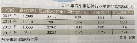 近日,一组来自中国汽车工业协会产销快讯的数据显示,2015年我国汽车零部件制造业统计的12090家企业的主营业务收入为32117亿元,同 比增长8.29%,这一增长率水平高于整体汽车行业4.73%和汽车制造业1.68%的水平;利润总额2464亿元,同比增长13.41%,也明显好于整 体汽车行业1.74%和汽车制造业-5.62%的增幅。