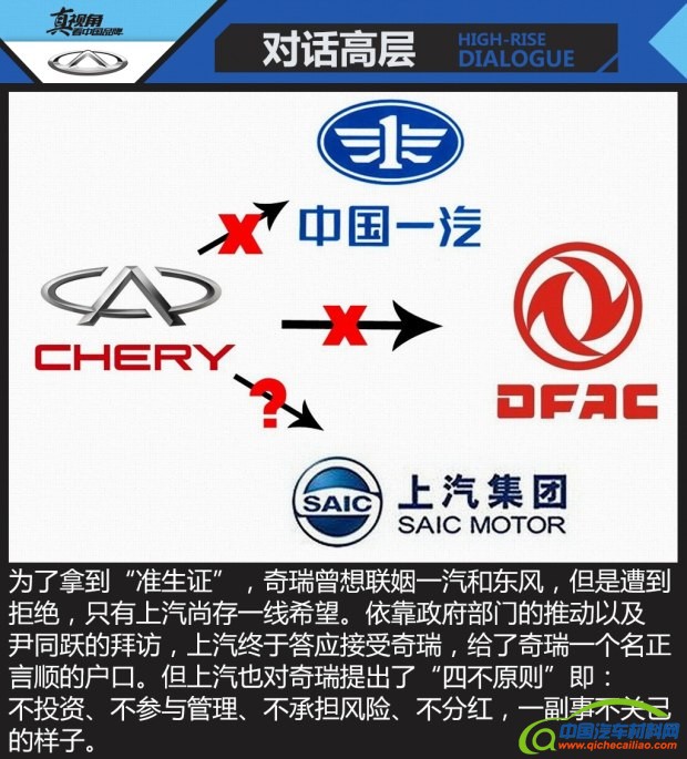 此外,在奇瑞的“出生阶段”还面临一个更重要的问题是“上户口”。奇瑞创立初期没有准生证,没有汽车准生证登不上国家轿车生产目录,从法律上讲也就无法在全国销售。为了获得生产资质,奇瑞想与当时国内大型汽车厂商联姻,加入三大汽车集团,这样就能解决该问题。