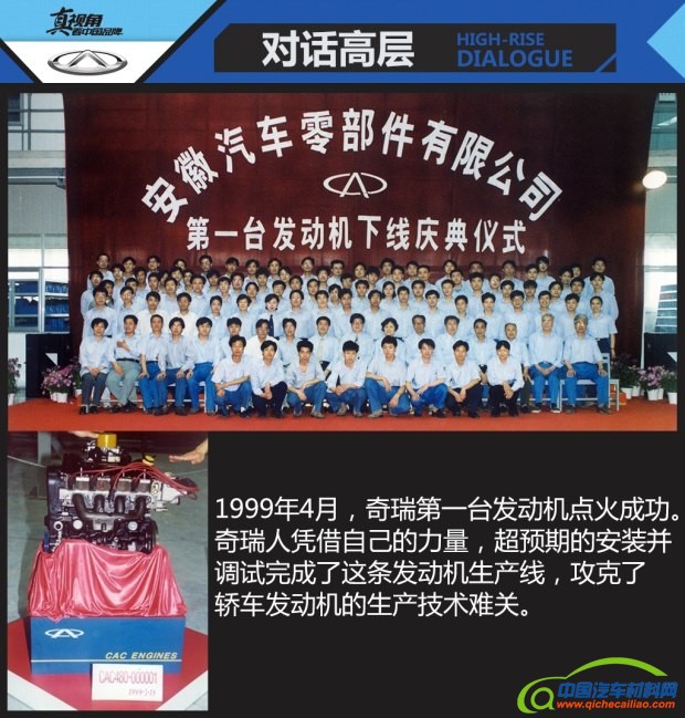 在奇瑞高速发展的时候,做技术出身的尹同跃也意识到,发动机技术是当时所有中国品牌以及奇瑞的软肋。为了改变这一现状,奇瑞首先着手的就是发动机技术。奇瑞首先采购了一条二手福特的发动机生产线,但在安装中出现了一些波折,英国专家不开放技术,奇瑞只能自己来干。在三个“大干50天”的艰苦奋斗后,奇瑞的第一台发动机终于下线。(想了解详细历史,可以点击这里)