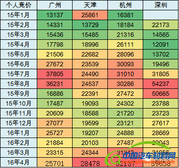 前期随着深圳房价暴涨,因此前几个月的个人拍牌价格偏高,但随着经济下行压力和单位用户购买力不足,个人拍牌价格也出现下调趋势。1月的广州价格下降到2.5万,相对7-8月的高价下跌较多。深圳也是暴跌一半,天津和杭州也是较高点大幅下降。随着今年的房价暴涨,需求心态不稳,汽车拍牌价格增长速度很快。