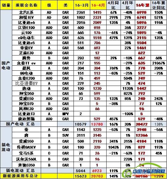 4月新能源乘用车呈现同比高增长和环比高增长的特征。16年4月新能源狭义乘用车销量20703台,同比增长149%,环比3月增33%,总体较好。其中插电混合动力达到6923台,同比增长119%,环比增长37%;纯电动车达到13780台,同比增长167%。环比增长30%。16年插电混动同比增速表现弱于纯电动轿车。