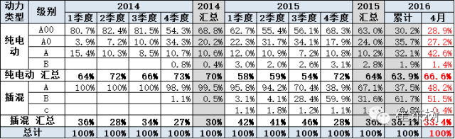 15年的纯电动车中的A00级车占比达63%,且A0级成为纯电动乘用车的绝对主力,这两类组合的经济型电动车成为主力。但16年1-4月的A级电动车爆发增长到36%,这是长安、吉利电动增量和比亚迪等产品转型的原因,同时也是A00级电动车的暂时调整的影响。
