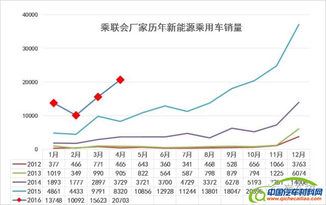 4月的新能源车销量20703台,同比15年4月的8320台增长149%,增速仍保持较高水平。历年的新能源车都是前低后高的加速拉升走势,15年从8月以来的新能源车销量进入拉升轨迹,15年年末几个月都是月度环比暴增,12月更是环比暴增万台左右,市场热度快速升温。16年1-3月的降温是符合正常的走势特征的,4月新能源车增1.5倍的恢复增长,环比3月增长33%,也是很好的表现。
