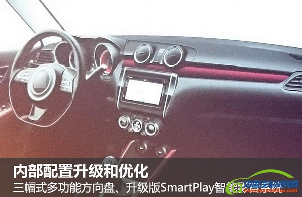 铃木新速翼特的内部配置也进行了升级和优化。新车采用了全新的三幅式多功能方向盘和运动风格显著的仪表组。此外,新车还搭载了一套升级版SmartPlay智能影音系统,并且配备有一款液晶触控显示屏,而且还配备有自动空调和空调循环通风口。