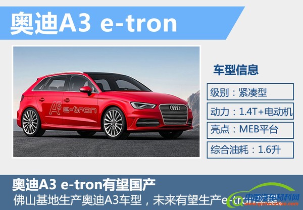 奥迪品牌目前国内仅有一款奥迪A3 sportback e-tron插电式混合动力车型,拥有150千瓦的综合功率和350牛米的综合扭矩。其百公里综合耗油仅为1.6升,以进口的形式在华销售。奥迪A3 燃油版车型就是在一汽大众华南佛山基地生产,未来奥迪A3 sportback e-tron车型有望率先在一汽大众华南佛山基地国产。