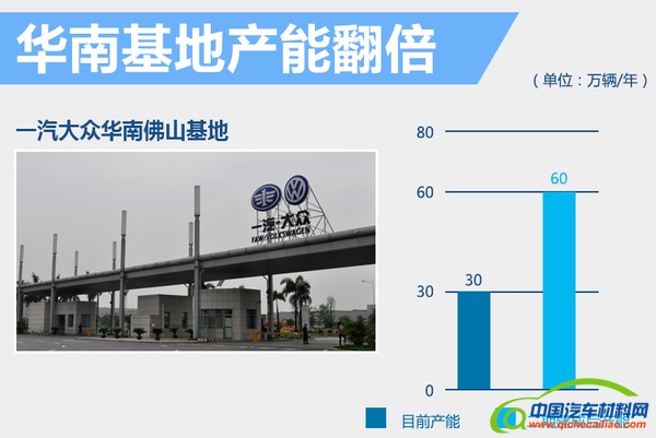 一汽大众华南佛山基地一期于2013年9月正式建成投产,占地100.39万平方米,规划建筑面积45.5万平方米,目前年产能30万辆,生产奥迪A3 Sportback、A3 Limousine和大众高尔夫7、高尔夫GTI以及今年五月份上市的高尔夫嘉旅车型。二期项目以于2014年5月初奠基,建设周期为36个月,项目建成后,整个华南基地产能将翻倍,具备60万辆产能。