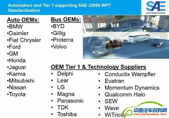 现行的SAE J1772标准是插电式充电方面的规范,并由绝大多数汽车制造商采用。而接受新的TIR J2954无线充电标准的汽车制造商包括戴姆勒(宝马)、菲亚特-克莱斯勒、福特、通用、本田、捷豹路虎、三菱、日产以及丰田。这些已签署协议的汽车制造商们的电动汽车目前占市面上绝大多数。据悉,一些位于行业供应链第一等级的原始设备制造商(OEM)们,比如德尔福、LG、松下、东京电气化学TDK等也都签署了新的无线充电协议。同时,生产应用于巴士的插电系统厂家,包括沃尔沃、比亚迪以及美国电动公交车公司普罗泰拉(Proterra)等,也共同签署了该项协议。