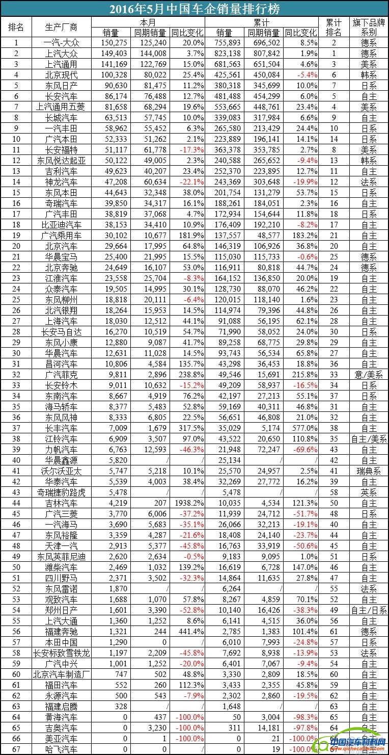2016年5月份,中国车企中销量三强依然是一汽-大众、上汽大众和上汽通用,销量分别达到150.3万辆、149.4万辆和141.1万辆,同比增幅各为20.0%、3.7%和15.0%。累计销量上,上汽大众以82.3万辆夺冠,一汽-大众的75.6万辆紧随其后,上汽通用的68.2万辆还是第3名。