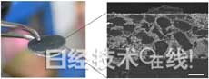 | 使用新负极分子材料的全固态锂电池及其截面的电子显微镜图 穿孔石墨烯分子进入电子显微镜图中灰白色的部分。发黑的部分是固体电解质 (点击放大) |