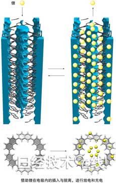 新负电极分子材料的运动模式图 借助锂(黄色)在穿孔石墨烯分子的缝隙和微孔部分(蓝色)的插入与脱离,进行放电和充电 (点击放大) |