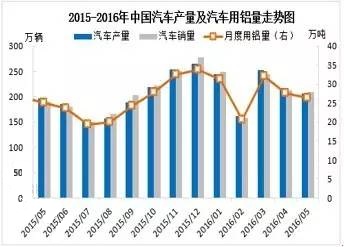 汽车用铝量26.3万吨(见图1),环比下降4.8%,同比增长5.2%,符合笔者预期(见图2),去年同期该值为25万吨。2016年1-5月份我国汽车用铝量累计138万吨,同比增长5.6%,增速较去年同期增加2.5个百分点。