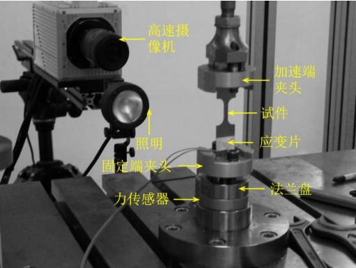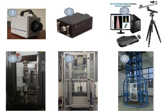 测试系统:1-高速摄像机;2-工业CCD(静态);3-非接触测量分析系统;4-万能试验机;5-高速拉伸试验机;6-落锤冲击试验台