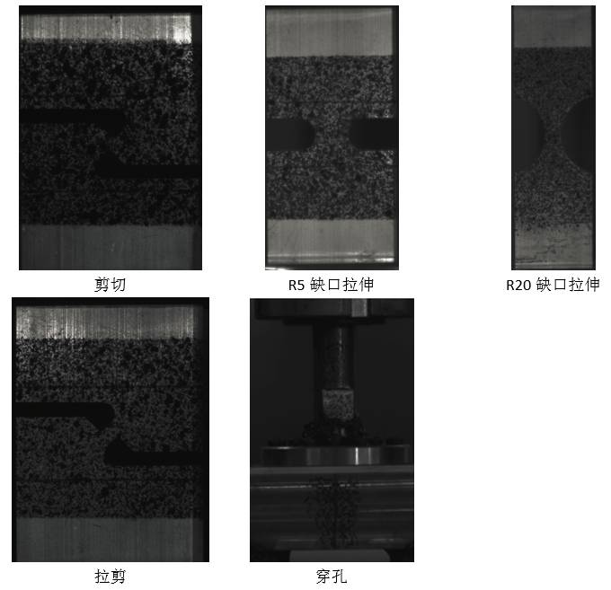 在汽车碰撞过程中,有部件会出现断裂现象,而很多企业在前期开发CAE模拟的过程中并未考虑或者仅仅采用一个等效断裂应变值来表征材料的断裂特性,但铝合金材料在不同的受力状态下的断裂应变差异很大,这对断裂的预测非常不利,因此需要通过多种应力状态的材料试验来获取更加全面的断裂信息,从而提高仿真预测精度。下面以某铝合金材料为例,测试内容包括了剪切、拉剪、R5缺口拉伸、R20缺口拉伸以及穿孔试验,所有试验均需要配合相应的夹具在万能试验机上完成,采用工业CCD拍摄整个试验过程,再通过非接触软件进行分析,获取变形信息。