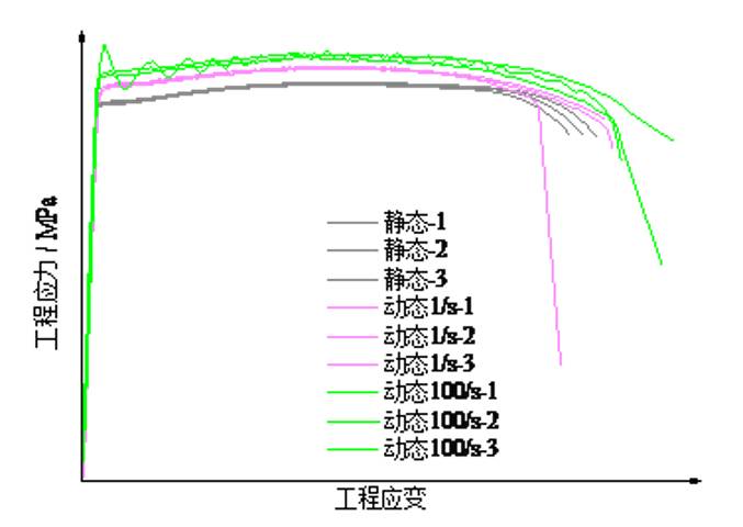 首先我们来看某铝合金材料的应变率效应,下面展示了准静态拉伸和高速拉伸的试验设置以及不同应变率下某铝合金材料的工程应力应变曲线。在100/s单向拉伸时,为了防止发生“ringing effect”现象,我们在试件上粘贴了应变片进行测力。从试验结果可以看出这种铝合金材料的应变率效应较明显;不同应变率下的延伸率基本一致。
