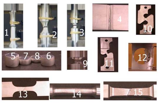 由于铝合金材料形式种类较多,不同形式种类材料性能也不一致,如某些铝合金的应变率效应不明显就不需要进行多个应变率拉伸试验;某些铝合金材料各向异性明显就需要进行不同方向的拉伸试验;铸铝材料断裂表征时需要进行多种类型试验(如下图所展示),所以不同类型铝合金的材料表征的试验矩阵还不尽一致,需要具体材料具体分析。