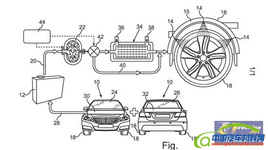专利图显示一辆奔驰轿车正在使用该系统为车胎喷射水雾。如果安装额外的喷水口,还可以达到为刹车盘降温的目的。目前类似的系统主要用于全球卡车比赛,在这类赛事中,刹车盘降温对车辆的性能优化起到了关键的作用。