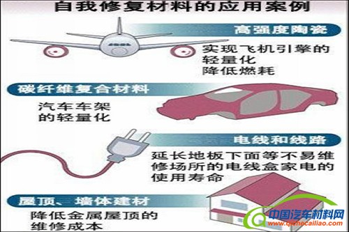 在碳纤维之间混入装有粘着剂的胶囊,出现裂缝后,胶囊断开,粘着剂流出完成修复。10天后将完全凝固,可恢复到原来的强度。预计将用于汽车和飞机的构造材料、以及人造卫星构件等方面。