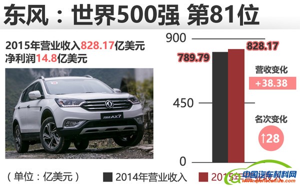 东风汽车集团今年在排行榜中的名次为81名,与去年的109名相比,名次提升28位。《财富》杂志公布,其去年总收入为828.17亿美元,利润为14.8亿美元。数据显示,2015年东风汽车集团累计销售汽车约286.7万辆,同比增长3.8%,市场占有率11.7%;其中乘用车销售约252.18万辆,同比增长7.8%,市场占有率11.9%;商用车销售约34.52万辆,同比下降18.6%,市场占有率10%。