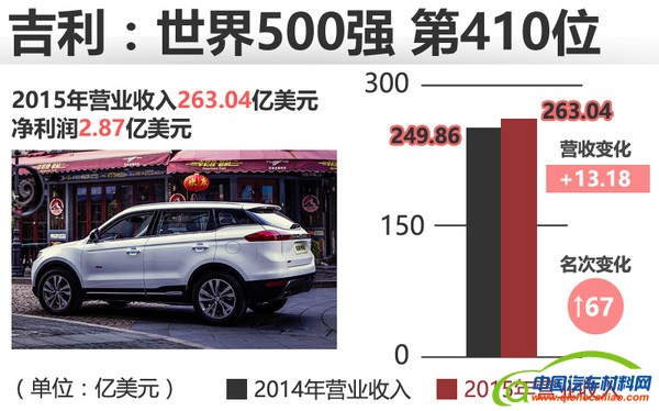 浙江吉利集团是中国汽车企业进入世界500强中唯一一家民营自主品牌企业,也是排名提升最快的企业,从去年的477名提升到今年的410名,排名提升67位。吉利2015年全年累计总销量为53.85万辆,同比增长约26%,在去年中国乘用车排名位列第13名。今年上半年吉利继续保持快速增长,上半年累计销量28万辆,同比增长11%,完成了全年目标的47%。