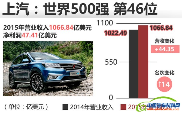 今年,中国车企排行榜的“龙头老大”位置仍旧被上汽集团占据,2015年全年营收1066.84亿美元,47.41亿美元的利润收入也是6家中国车企中最高的。从500强榜单第60名“跃升”至今年的46名,排名提升14位,这是上汽集团代表中国车企首次冲入世界500强的前50名。