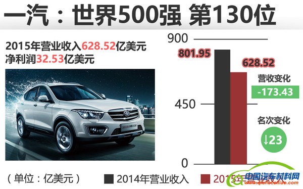 一汽集团从去年的全球排名107名,下降至今年的130位,下降23名次,一汽集团排名下降的主要原因在于去年销量下滑7.8%,累计销售整车284.39万辆。