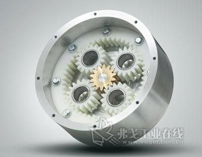 这款创新的齿轮传动装置,有一个安装在电机轴上的14齿、模数为3、直径42mm的中心齿轮。中心齿轮驱动4个与输出轴相连的17齿、直径51mm的行星齿轮。行星齿轮在一个51齿、直径150mm的固定内齿轮上转动。所有齿轮的齿宽均为25mm。