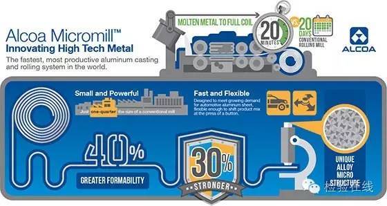 目前来看,能够生产新一代铝合金ABS(Auto Body Sheet)的工艺并且满足上面诸多条件有三种:哈兹雷特法,美国铝业公司的Micro-Mill法与美国特殊合金公司的工艺,它们都于2015年诞生于美国。Micro-Mill法的商业化生产线建在美国铝业公司得克萨斯州圣安东尼奥轧制厂内,生产的ABS已经通过了汽车制造厂的试用与认证。