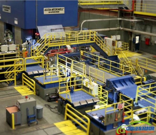 美国铝业公司的小型轧机(Micromill)可以生产新一代汽车铝板带,所生产的汽车合金的成形性比现行铝合金的高40%以上,而强度性能则大30%,并且表面品质优秀,可满足汽车工业的苛刻要求。用所产板带材制造的零部件的成形性比高强度低合金钢的大一倍,而其质量却比钢的轻30%。半成品的加工时间大为缩短,因为与常规热轧工艺相比省掉5道工序:铸锭锯切头尾、均匀化退火(这是一道长时间的工序)、铣面、热轧前加热、热轧。因此,从铝合金熔体备好后到热轧成供冷轧用的带卷由20d缩短到20min。