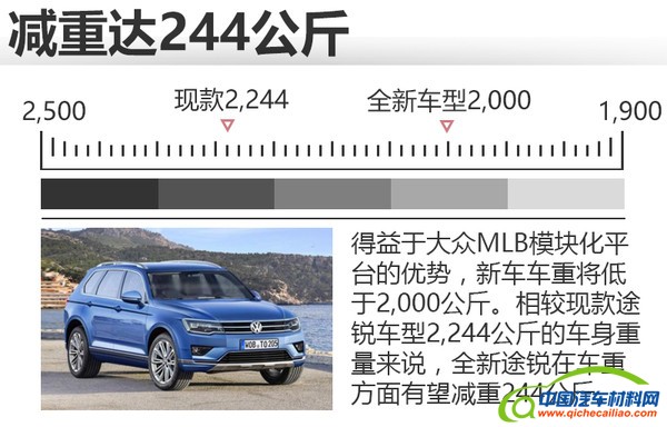 自2010年第二代途锐推出以来,已经走过了6个年头,临近大众品牌产品普遍换代的时间点。有海外媒体报道称,大众即将推出第三代途锐车型,有望在2017年4月的上海车展正式发布。网通社通过梳理相关新车消息后发现,大众全新一代途锐将基于MLB Evo平台打造,有望大幅减重244公斤。