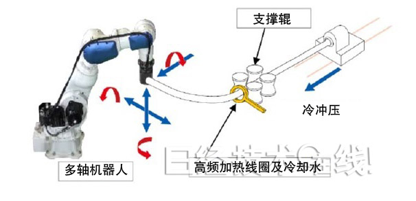 而3DQ法通过对截面形状为圆形及方形的钢管实施局部加热及淬火来提高强度,同时使用多轴机器人实施弯曲加工,这样一来,即使是封闭截面的部件,也可用一道工序制造沿长度方向复杂弯折的产品(如图)。而且,这种方法还可制造液压成型难以实现的1.5GPa级上的部件。
