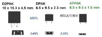 燃油动力车及电动车需要更小尺寸和更高功率密度的功率器件。安森美半导体独特的ATPAK封装技术可满足这要求。如下图所示,与业界传统的DPAK和D2PAK封装相比, ATPAK的封装尺寸大大减小:DPAK比D2PAK占位面积小60%,厚度小49%,而ATPAK虽然与DPAK保持相同的占位面积,但厚度却又减少了35%。