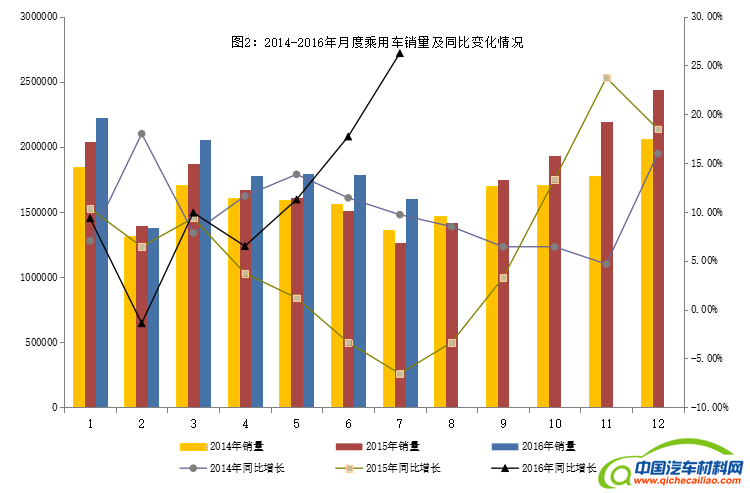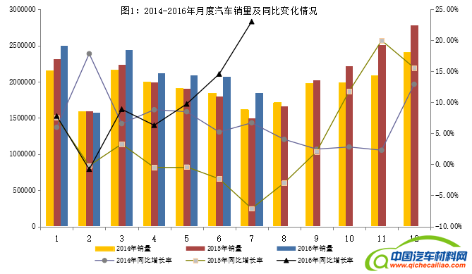 2016年7月,汽车产销比上月均呈下降,同比呈较快增长。1-7月,汽车产销保持稳定增长,增幅比上半年继续提升。