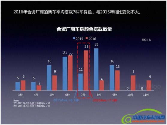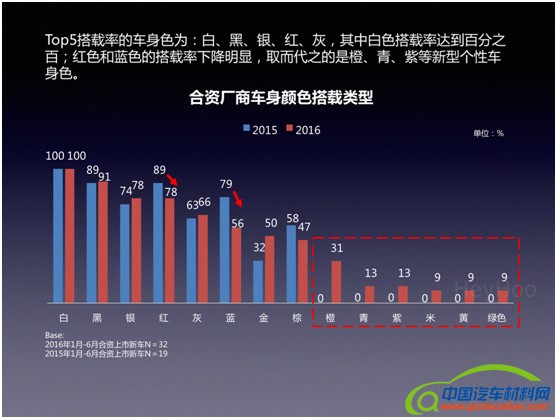6. 合资厂商上市新车平均搭载7种车身色,Top5是白、黑、银、红、灰。