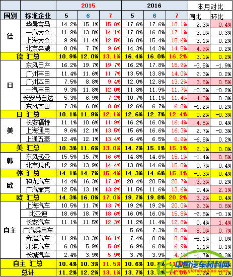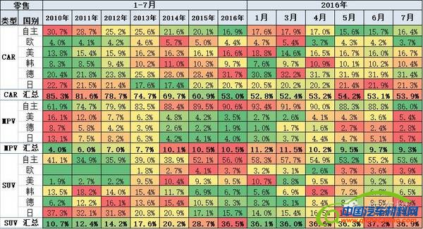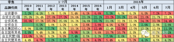合资主力车型15年相对14年的普遍走弱,但15年豪华车表现较强。16年的豪华车走势持续较强,份额达到7%的近期低点.7月合资日系走强。合资自主和国有自主走强在16年较突出。