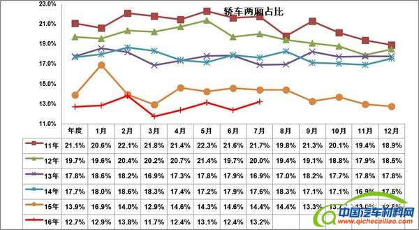 前几年轿车市场的两厢车型占比持续下降,14年达到17.7%,15下降到13.9%,16年是12.7%。其中的1月两厢车销售比例下降到12.8%,7月两厢比例13.2%,持续低于同期水平。这样的两厢持续下降趋势趋势体现了入门级小车的车身式样多样化趋势。小型MPV类微客的载客需求发展较快,小型SUV也是快速崛起,这都对两厢轿车的影响也是较大的。