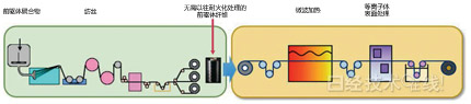 | 图1:现行的PAN类碳纤维制造方法 将PAN纺成丝后实施耐火处理,即空气中加热至200~300℃使之氧化,赋予其耐热性。该工序耗时30~60分钟。 |