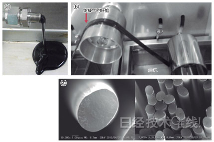 | 图3:用新工艺制造碳纤维 (a)利用用于服装的低价格PAN制造的前驱体聚合物。(b)在纺成丝的PAN中添加溶解促进剂和氧化剂,在液体中实施氧化处理。(c)用新工艺制造的碳纤维。 |