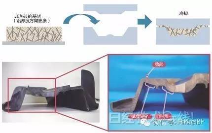 据东丽介绍,经过冲压成型时的加热,粘合剂树脂会变软,同时,制造基材时被压缩的碳纤维也会在回弹力的作用下沿着基材的厚度方向发生膨胀。这样一来,各位置厚度不同、形状复杂的部件也能实现一体成型(图3)。冲压成型后一冷却,粘合剂树脂与碳纤维就会再次牢固地结合在一起,从而可获得与以往的GFRP同等的弯曲弹性模量。