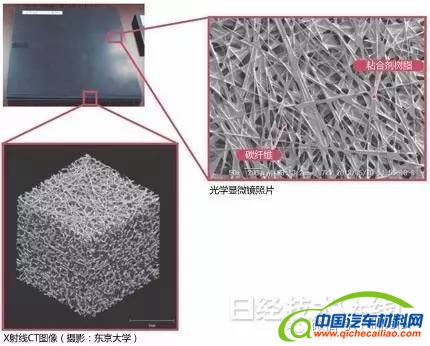 从制造方法来看,东丽将连续的碳纤维(直径约为7μm)切成了10mm左右的长度。将这种碳纤维和基于热塑性树脂的粘合剂树脂混合在一起,在装有溶液的模具内一边加热,一边使碳纤维均匀分散。然后,在将溶液从模具中排出去的同时进行压缩,最后制造出多孔构造的片状或者卷状基材。按体积比例计算,碳纤维的含量约为20%,空间约占50%。片状基材可以生产厚度为0.5~3.0mm的产品,卷状基材可以生产厚度为0.1~0.5mm的产品。