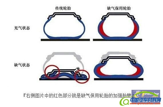 防爆轮胎学名叫“泄气保用轮胎”,英文缩写RSC。 充气后的轮胎胎壁是支撑车辆重量的主要部位,特别是一些扁平比(扁平比是轮胎高度与宽度的比)较大的轮胎,胎壁非常“肥厚”,“爆胎”严重时通常会导致胎壁的瞬间开裂漏气,从而使轮胎瞬间失去支撑力,导致车辆重心立刻发生变化,特别是前轮驱动车的前轮爆胎,爆胎后瞬间的重心转移很可能会令车辆失控。