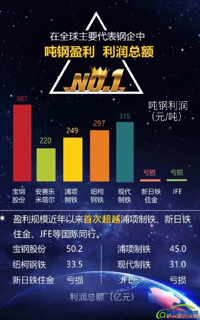 国内同行最优业绩、吨钢盈利及利润总额全球主要代表钢企排名第一