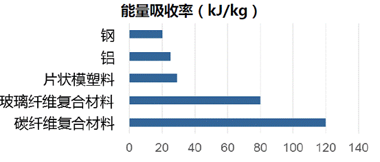 碳纤维复合材料具有其他材料不可比拟的比强度和比模量,密度只有1.6g/cm³左右,远低于钢铁和铝,将其应用于车身及其它零部件的设计可降低整车质量的35%左右,降低燃油消耗,如大众新推出的采用碳纤维复合材料车身和零部件的XL1车型总质量只有795kg,结合混动技术,百公里油耗仅0.9升。