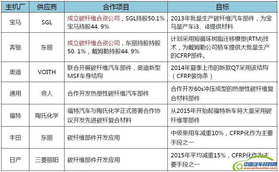 国外在碳纤维复合材料方面的发展已初具规模,形成了碳纤维供应商+复合材料供应商+零部件供应商+主机厂的联盟式产业化布局。最具代表性的就是宝马公司:宝马公司是首家将碳纤维复合材料大规模应用于汽车制造的厂商,不仅在新能源汽车i8与i3上采用碳纤维车身还为高性能M车型设计了众多内外饰的零部件,而碳纤维材质的传动轴、轮毂、方向盘等功能性零部件也正在应用或者即将应用与旗下众多车型。此外,丰田、本田、日产和福特等厂家也已经将碳纤维复合材料应用于旗下高性能汽车。而奥迪,奔驰等其他厂家厂商也相继发布了CFRP概念车,将逐步应用于具体车型。下表为国外主机厂与碳纤维供应商的合作现状:
