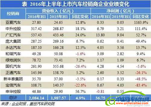 今年上半年乘用车市场销量稳定增长,国内经销商上市企业业绩也较去年同期有所好转。根据盖世汽车研究院整理的数据,统计的12家汽车经销商上市企业今年上半年营业收入合计实现了2,084.14亿元,同比上涨了4.9%;净利润也实现了同比上扬,由2015年同期的33.14亿元升至36.75亿元,同比攀升10.9%,平均净利率1.8%,较去年同期微涨0.1个百分点。